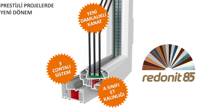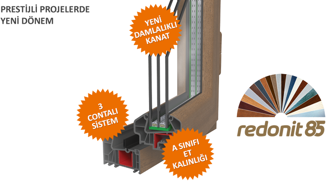 - Redeonit sistemi, 85 mm profil genişliği, 7 odacık sistemi, 44 mm ye kadar cam ünitesi kullanabilme özelliği, odacık genişlikleri ve profil yüksekliği gibi üstün özellikleri ile pencere sistemlerinde sağlanabilecek en düşük ısı iletim katsayısını elde etmek için tasarlanmıştır.